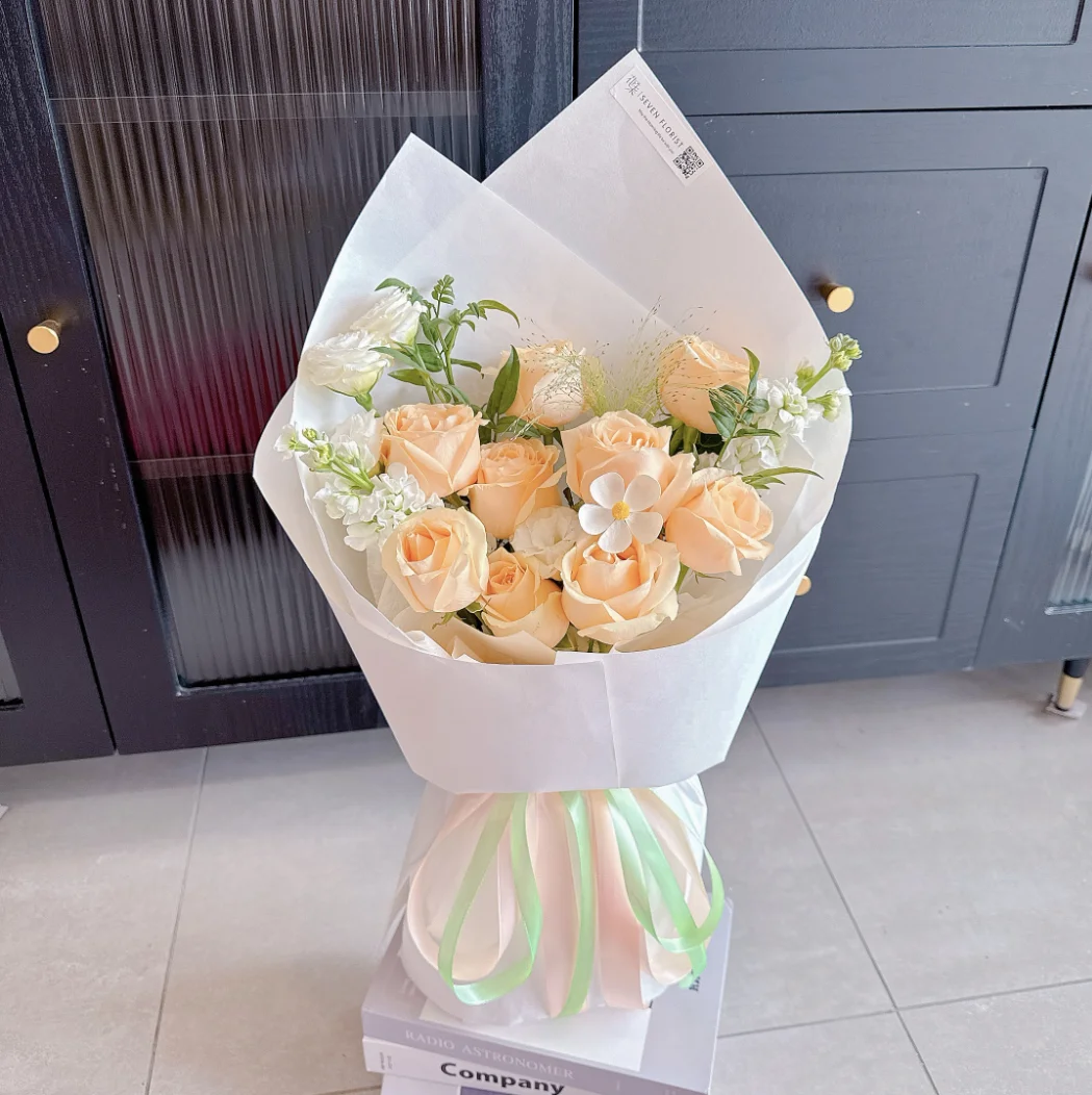 Flower: 9 Roses, 2 White M atthiola, White Eustoma, Panicum, Nine Star Leaf